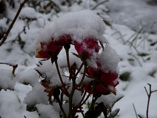Rechts: Eine lebende Rose konnte ich auch noch finden. Sie ist aber mit Schnee bedeckt und wächst aus der Erde nicht aus einem Baumstumpf.