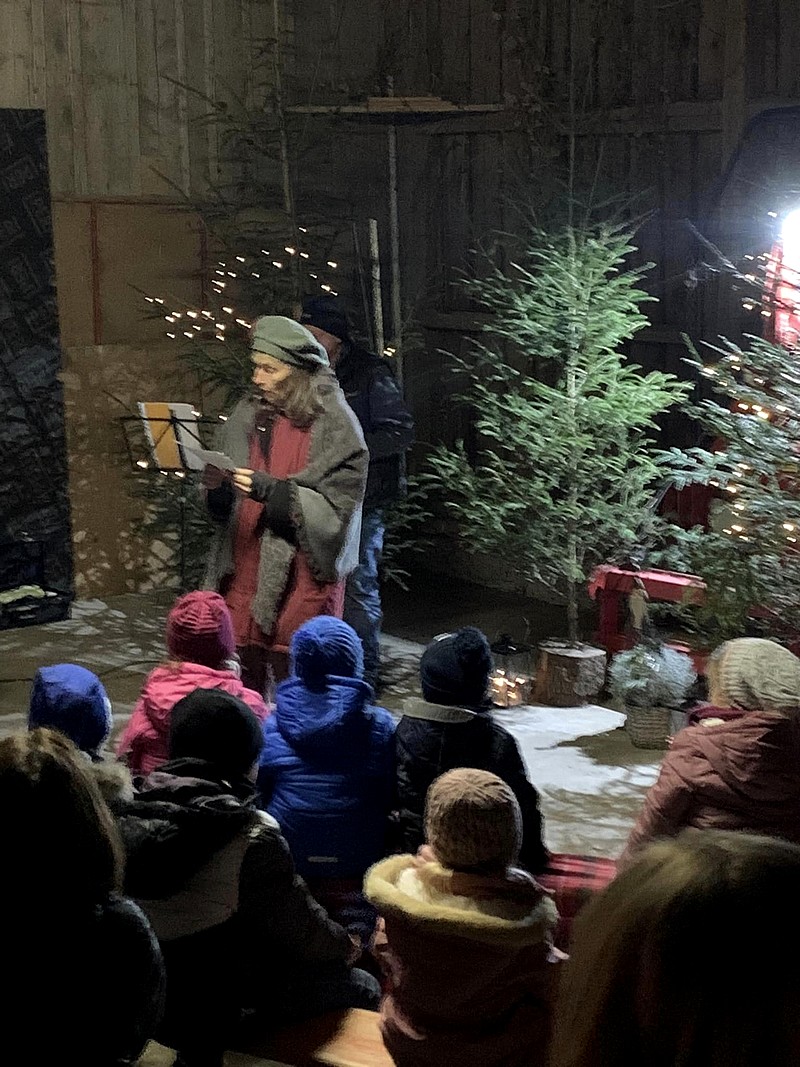 Neu war in diesem Jahr der Sternenabend. Wir feierten am 2. Adventssonntag die Beleuchtung unseres Sternes. Ein mit Kerzen und Fackeln gesäumter Weg führte uns von der Straße zum Feuerplatz. Von wo aus man den Stern gut sehen kann. Nach der Begrüßung las die Pfarrerin Frau Keller uns eine Sternengeschichte vor.